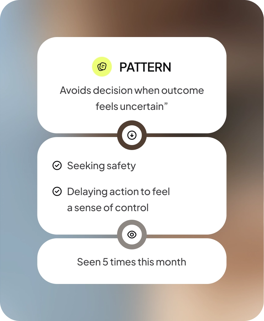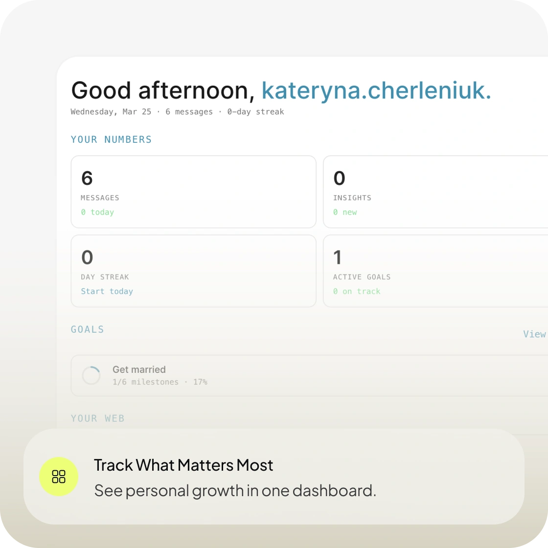 A structured view of your personal growth, bringing together your messages, insights, goals, and recurring patterns in one clear interface. The dashboard makes it easier to see what’s changing, what keeps showing up, and where meaningful progress is happening.
